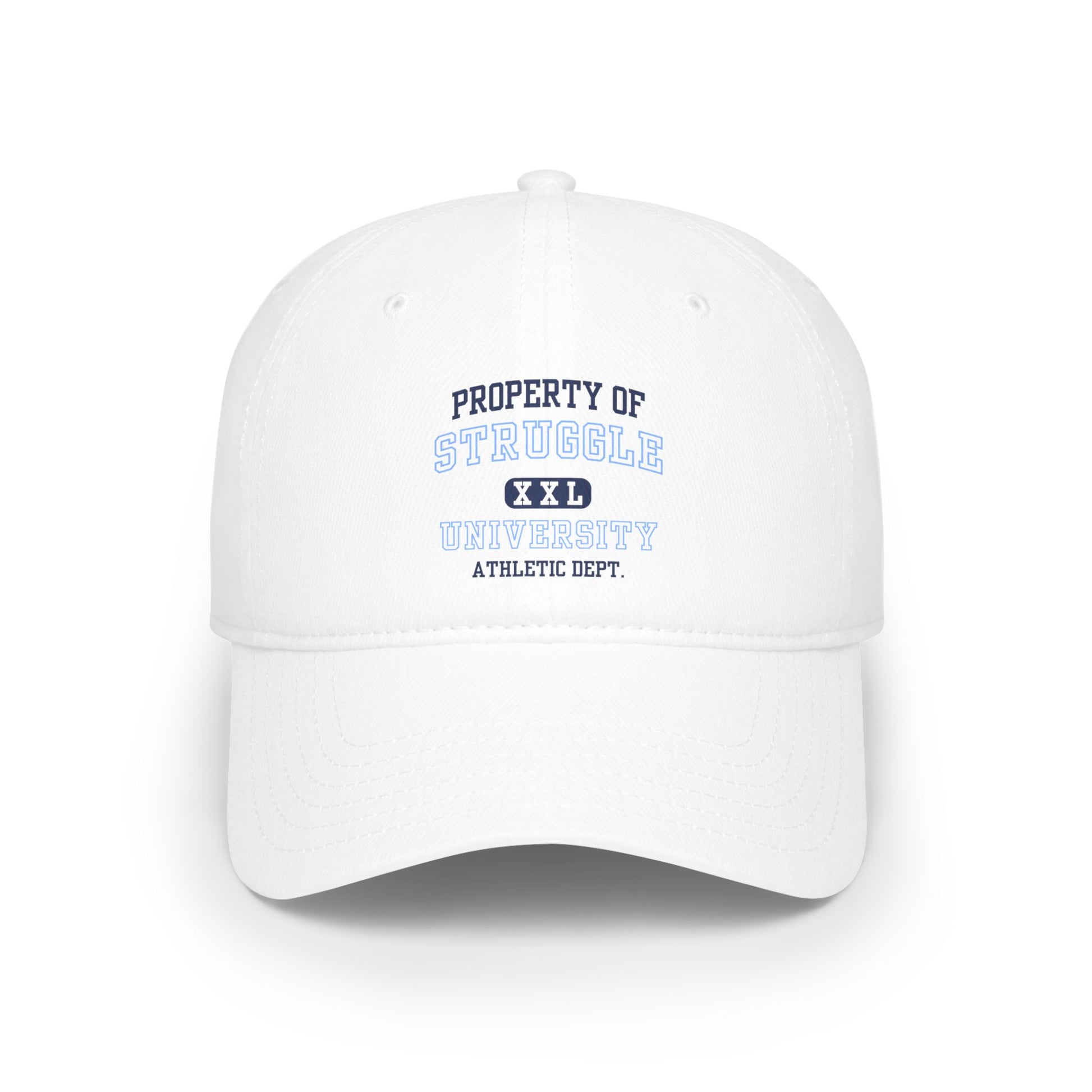 A low profile baseball cap with the phrase 'Property of Struggle University' printed on it. This cap gives off a casual and humorous vibe, perfect for everyday wear or as a fun gift. Ideal for students, graduates, or anyone with a sense of humor. Relevant for back-to-school season, graduation gifts, or as a novelty item.